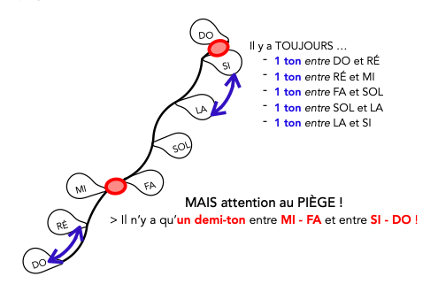 quand je dis « do – ré – mi – fa – sol – la – si – do », c’est un exemple (parmi tant d’autres) de gamme Majeure PARCE QUE cette suite de notes compose une suite de distances caractéristiques : 1 ton (entre do et ré) – 1 ton (entre ré et mi) – 1/2 ton (entre mi et fa) – 1 ton (entre fa et sol) – 1 ton (entre sol et la) – 1 ton (entre la et si) – 1/2 ton (entre si et do)*.